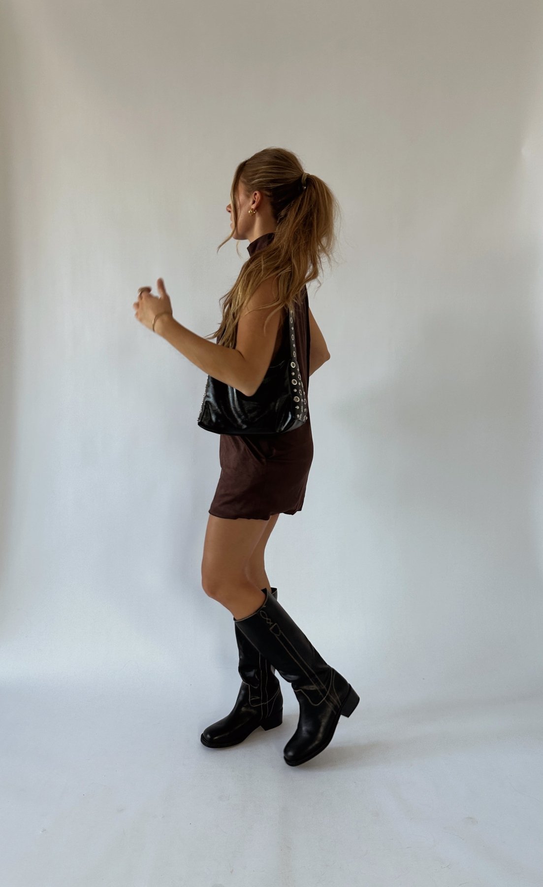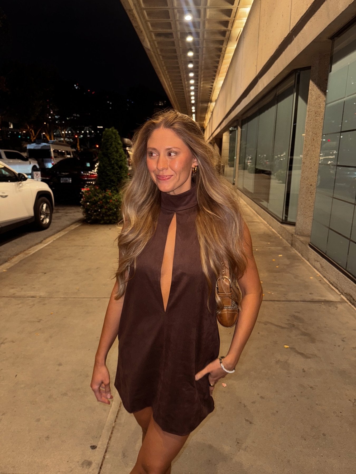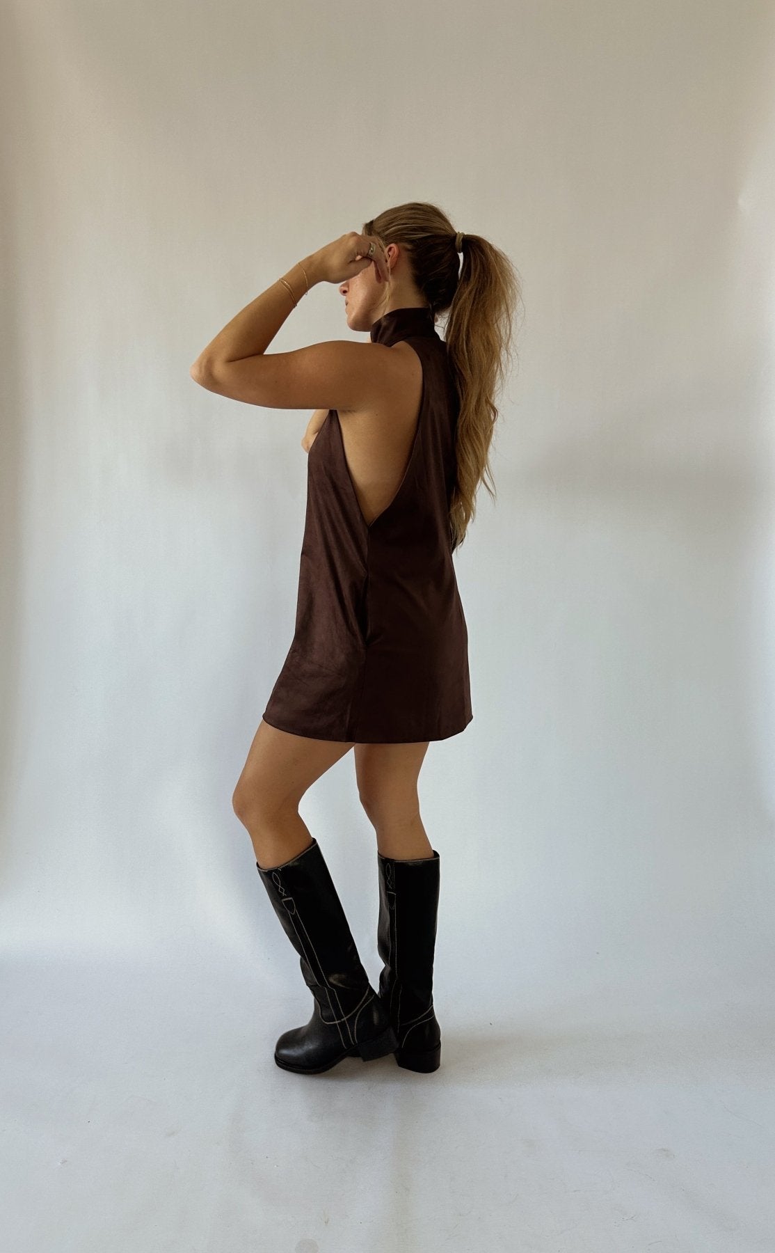 Introducing the Brown Keyhole High Neck Mini Dress, featuring an open front and back slit halter neck design. Made with 90% polyester and 10% spandex for a comfortable and flattering fit. Show off your style with this chic and versatile dress.
