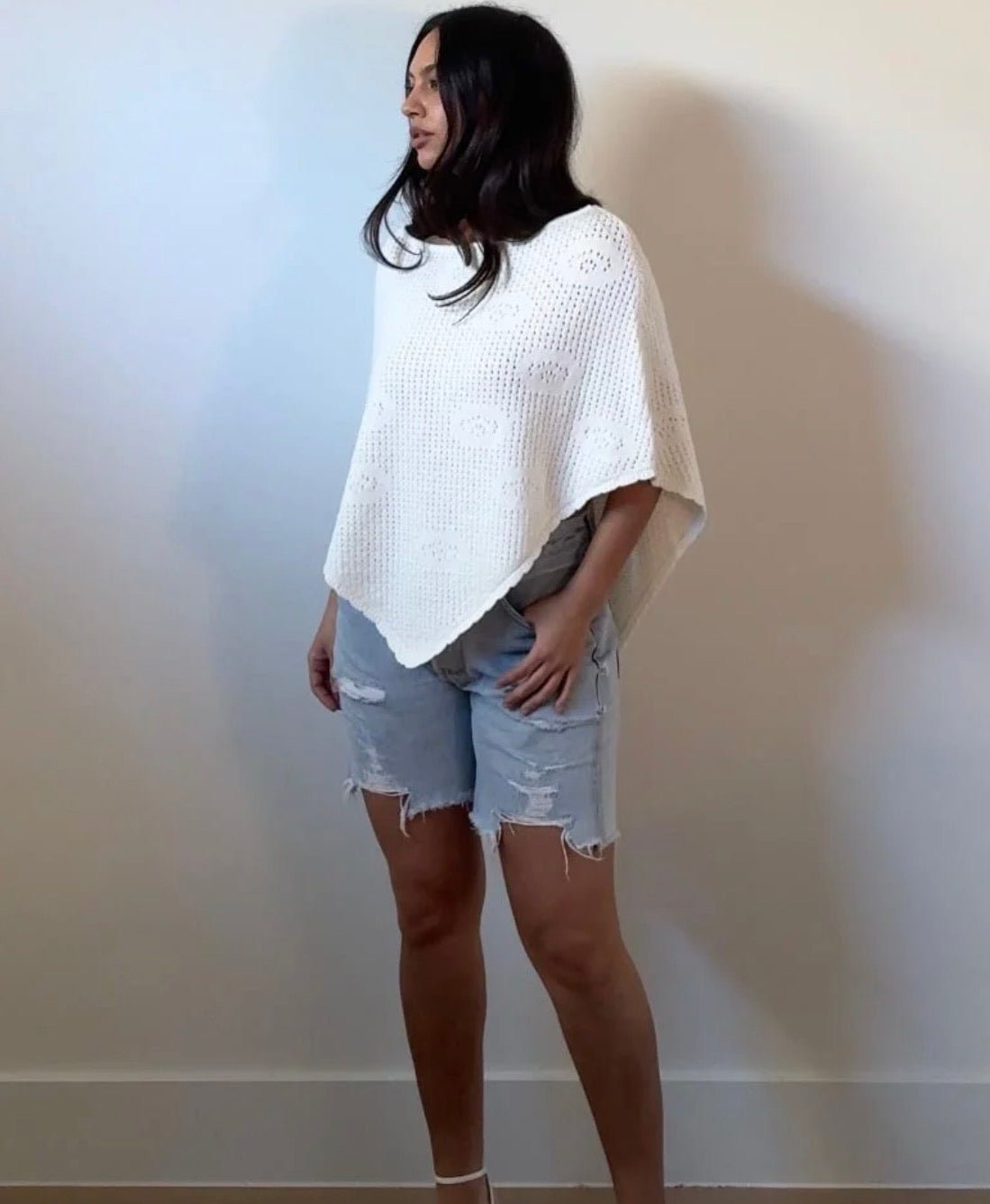 The Estella Knit Poncho is made from a blend of 50% Viscose, 30% Nylon, and 20% Polyester, ensuring a lightweight and breathable garment. Its airy open-weave texture and relaxed silhouette allow for versatile styling, making it suitable for layering over various outfits. Ideal for warmer weather, this poncho adds subtle sophistication to casual or vacation looks. Hand wash recommended for optimal care.