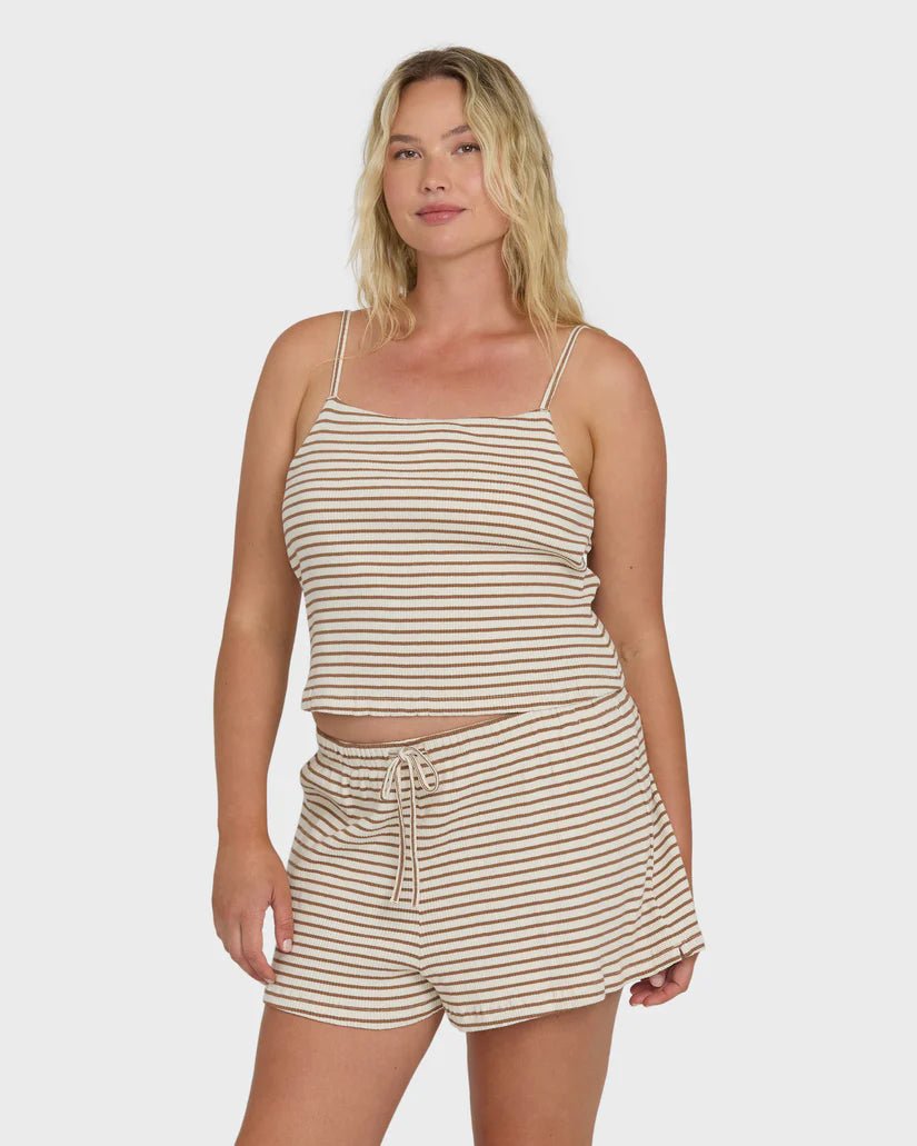 Easy days, sorted. The Easy Livin Cami is that soft, ribbed tank you throw on without thinking and somehow always feel good in. Made of stretchy knit with a fitted shape, it keeps things close but comfy, with a straight neckline, adjustable straps, and an interior shelf bra for a bit of built-in support. Finished with a tiny metal logo hit, it layers under everything or holds its own with cutoffs and sun-warmed skin. Brown Stone keeps it neutral, so you can wear it on repeat without getting bored.