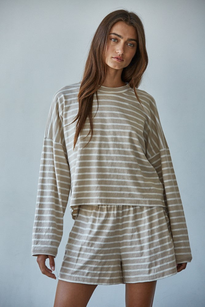 Upgrade your lounge game with our Lounge Striped Long Sleeve Top. Made with soft knit cotton, this top features a stylish mock neck and drop shoulder design for a relaxed fit. Mix and match with our coordinating shorts for the ultimate cozy and chic look.