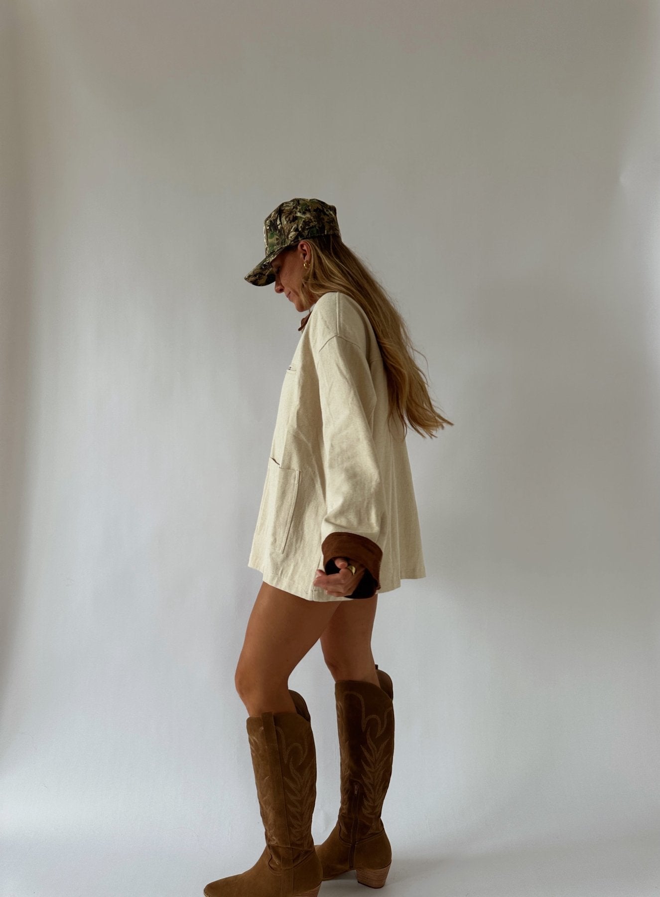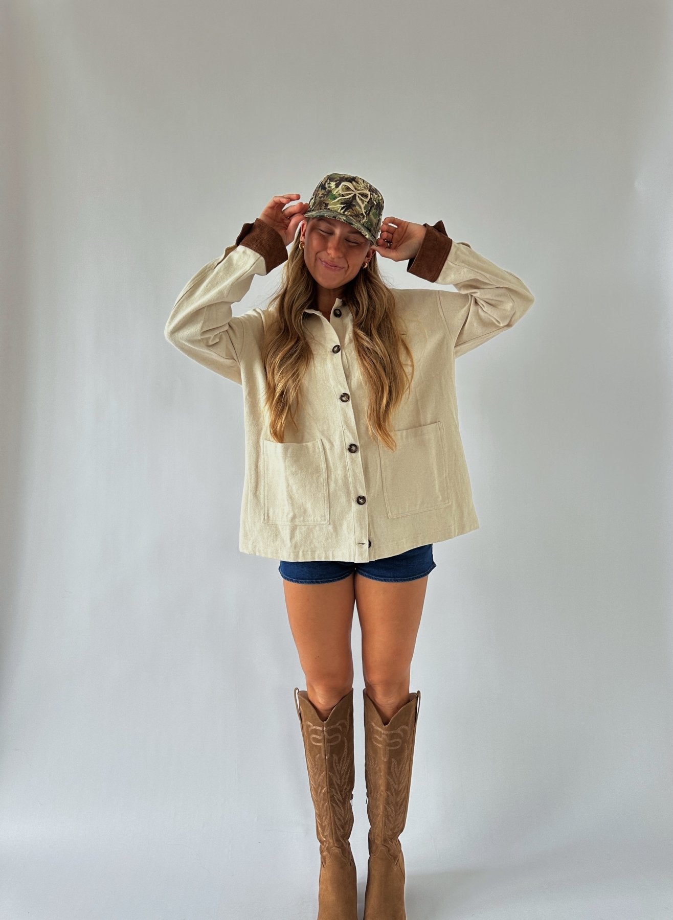 Introducing the Cream Barn Jacket. With its oversized fit and 100% cotton material, this jacket provides both comfort and style. The corduroy collar adds a touch of sophistication, making it the perfect addition to any outfit. Stay warm and stylish this season with our barn jacket.