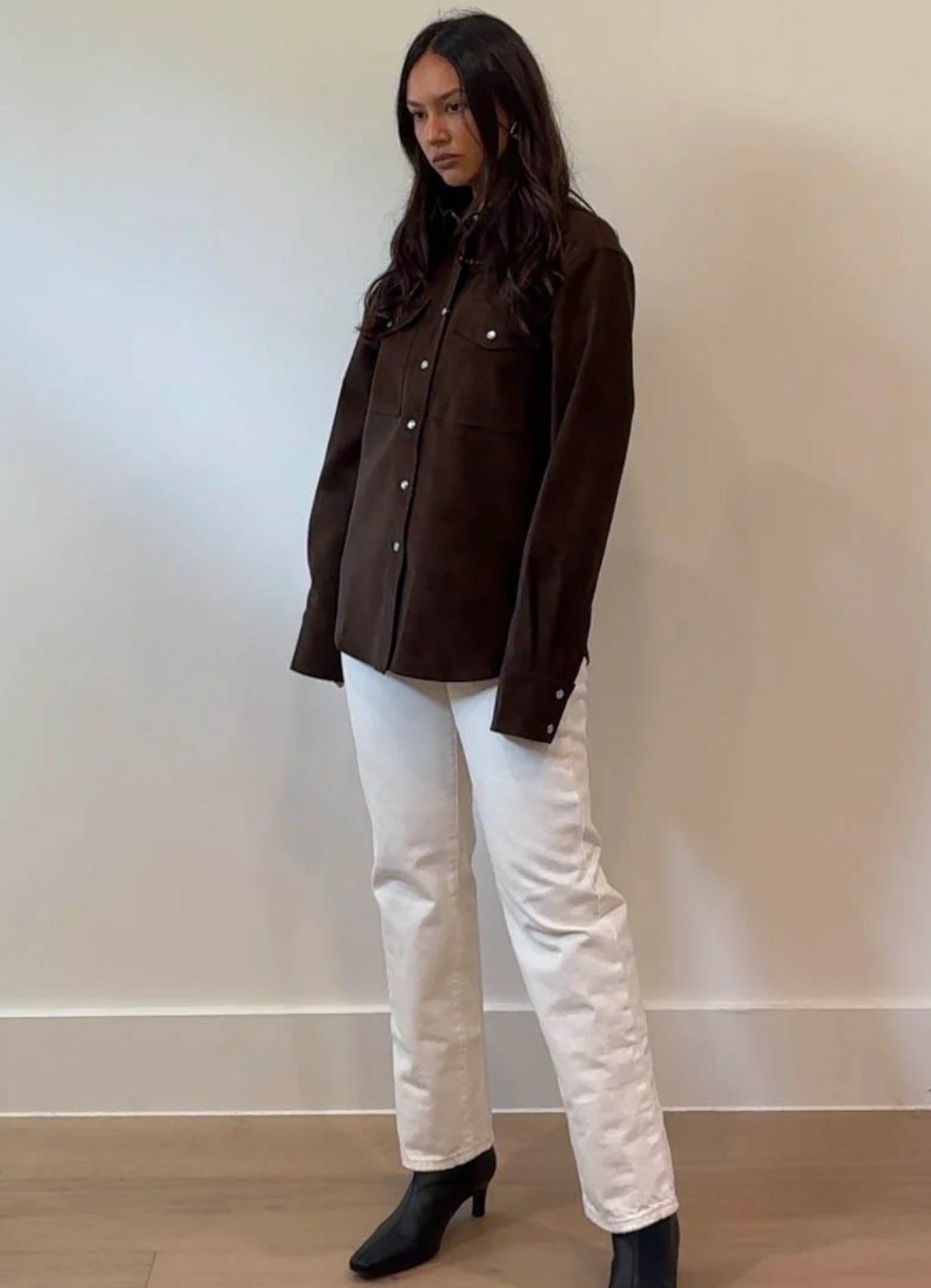 This dark brown suede button-up shirt combines style and comfort with its soft texture and snap button closure. The chest pocket adds functionality, while box pleats provide a relaxed yet tailored fit. Made of 50% polyurethane and 50% viscose for durability and a polished appearance.