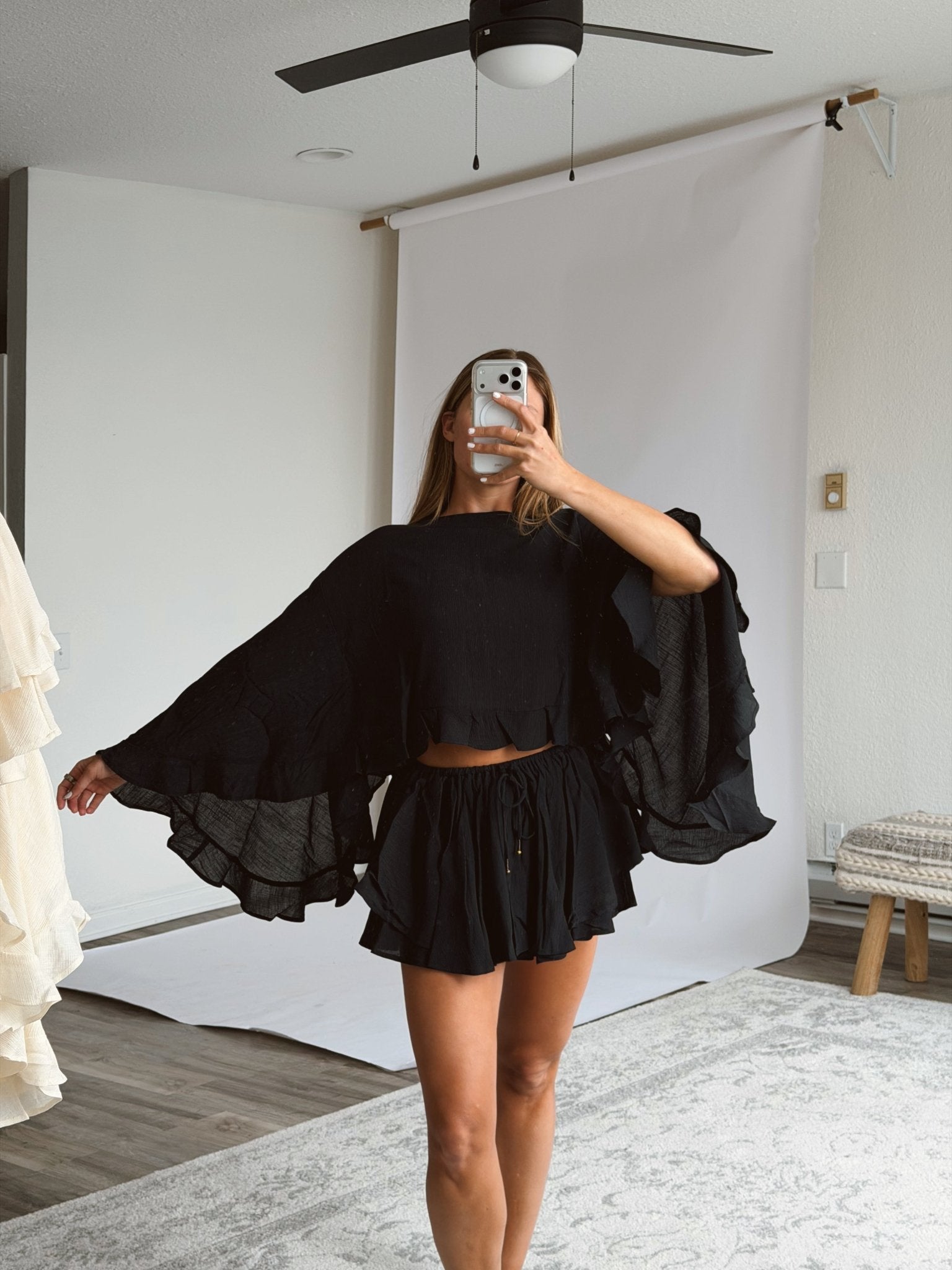 Meet The Teresa Top in Black: your new go-to top this spring and summer! This flowy woven rayon nylon top has a round neck and a cheeky back slit detail. Pair this top with the matching shorts (sold separately) or dress it down with some denim!