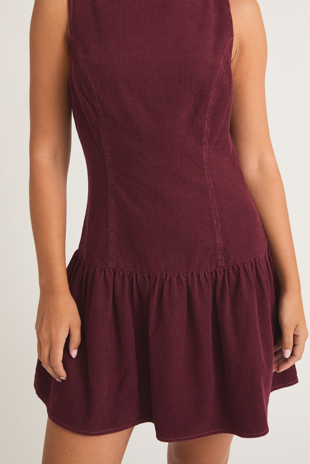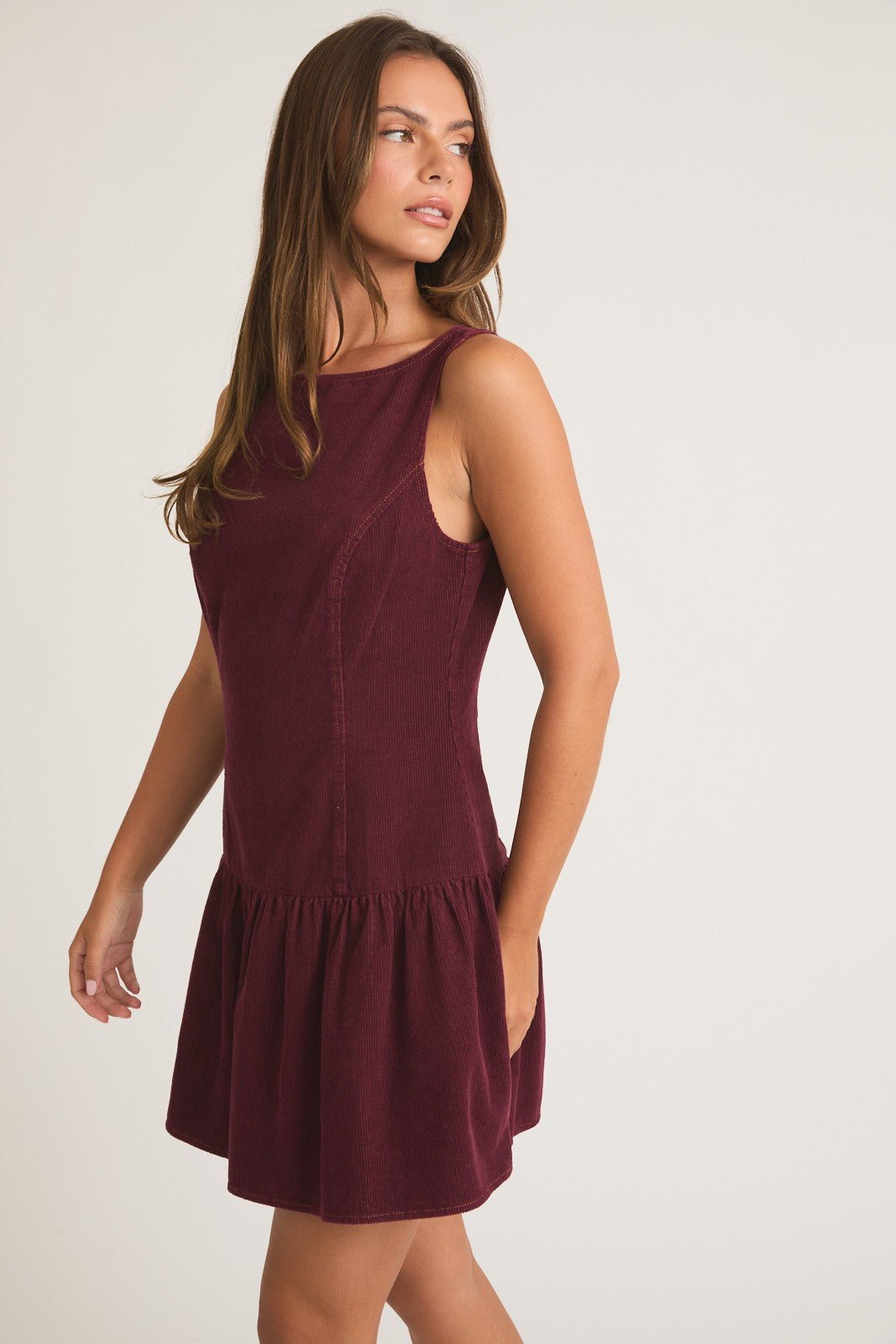 Upgrade your wardrobe with our Low Waist Burgundy Mini Dress. Made from luxurious corduroy, this sleeveless dress features a low waist design for a flattering silhouette. Perfect for any occasion, you'll love the stylish and comfortable fit of this mini dress. Stand out in style with this must-have addition to your closet.