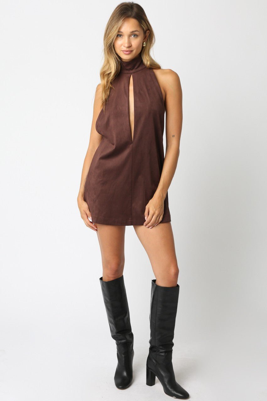 Introducing the Brown Keyhole High Neck Mini Dress, featuring an open front and back slit halter neck design. Made with 90% polyester and 10% spandex for a comfortable and flattering fit. Show off your style with this chic and versatile dress.
