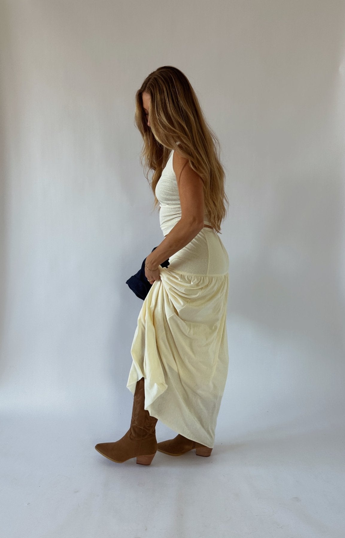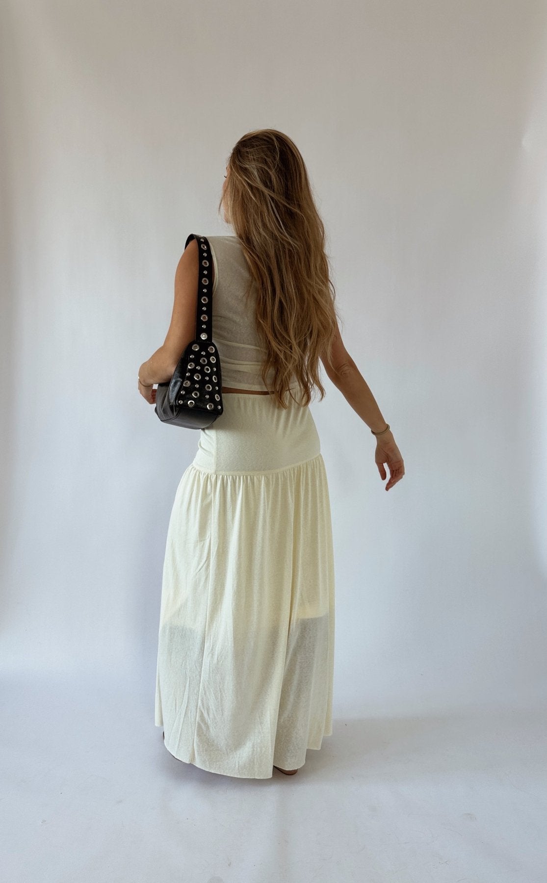 This exquisite ensemble features a chic boat neck top that beautifully frames the shoulders, offering a sophisticated yet relaxed silhouette. The sleeveless design ensures comfort and breathability. This set provides a flattering fit that moves with you, while the wide waistband of the maxi skirt adds an extra touch of elegance and support.