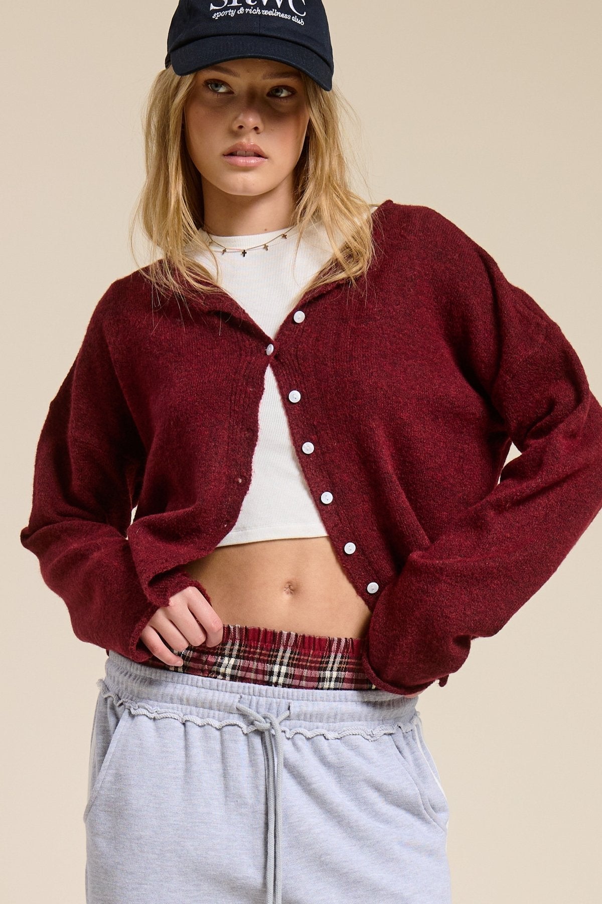 Experience ultimate comfort and style with our Staple Cardigan in burgundy. The rolled collar and button down front add a touch of elegance, while the long sleeves and drop shoulders provide a relaxed fit. Made with a blend of polyester, acrylic, nylon, wool, and spandex for superior softness and durability.